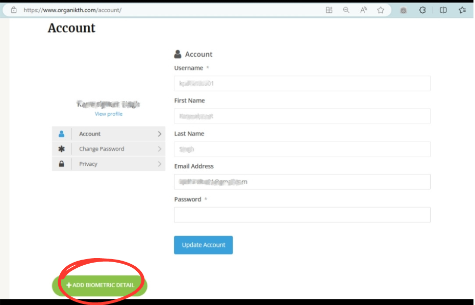 2. On the personal account page, click on the button “Add Biometric Detail” present at the bottom, common options include fingerprint scanner, facial recognition, or iris scan. You can add any of the biometric types according to your preference and device.