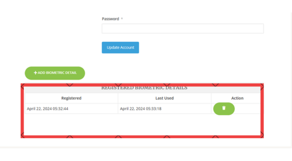3. After enrolling the biometric, the registered biometric details table get updated with new biometric data on the personal account page.